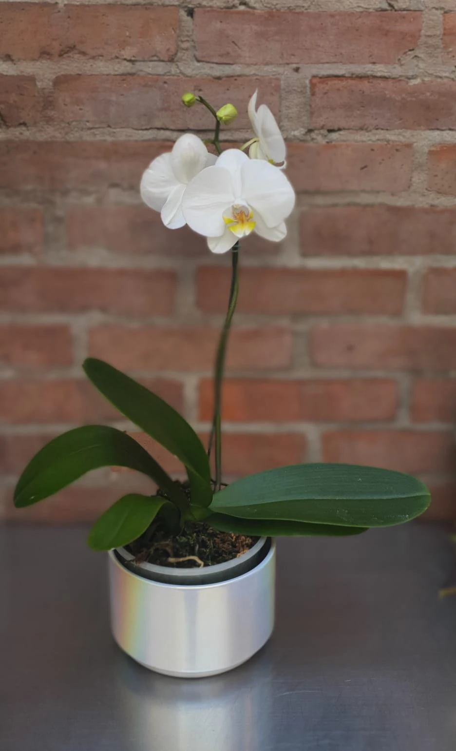 Planta, orquidea con flor blanca en maceta de cerámica baja tornasolada.